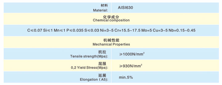 630不銹鋼是沉淀、淬水、馬氏體的不銹鋼。這個等級具有高強度、硬度和抗腐蝕等特性。經過熱處理后,產品的機械性能更加完善。這個等級不能用于高于300℃ 或非常低的溫度下,它對大氣及稀釋酸或鹽都具有良好的抗腐蝕能力,它的抗腐蝕 能力與304和430一樣。